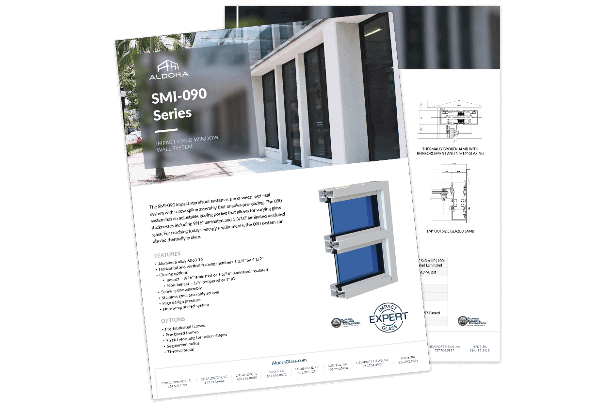 Aldora’s SMI‑090 impact storefront system is a non‑weep, wet‑seal design featuring a screw‑spline assembly and an adjustable glazing pocket that supports multiple glass thicknesses for versatile project needs. It can be fully pre‑glazed for efficient installation and offers optional thermal break upgrades to help meet today’s energy performance requirements.